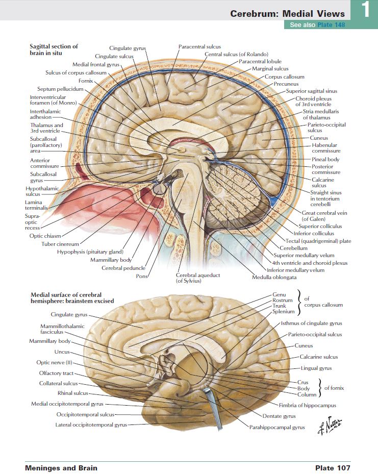 Так ось, цей процес запускається… я ж знав, що потрібно було взяти атлас Неттера сьогодні вранці. З якоїсь причини я відмовив себе в останній момент, а тепер ось шкодую. Ну ладно. Отже, якщо поглянути на серединно-сагітальний розріз голови, ми виявимо такий закруглений виступ. І цей закруглений виступ… о, чудово, дякую величезне. Так, давайте розшукаємо цей малюнок, відмінно, ось він. Це плакат сто сім у цій версії атласу Неттера під назвою «Вид з медіальної сторони головного мозку».