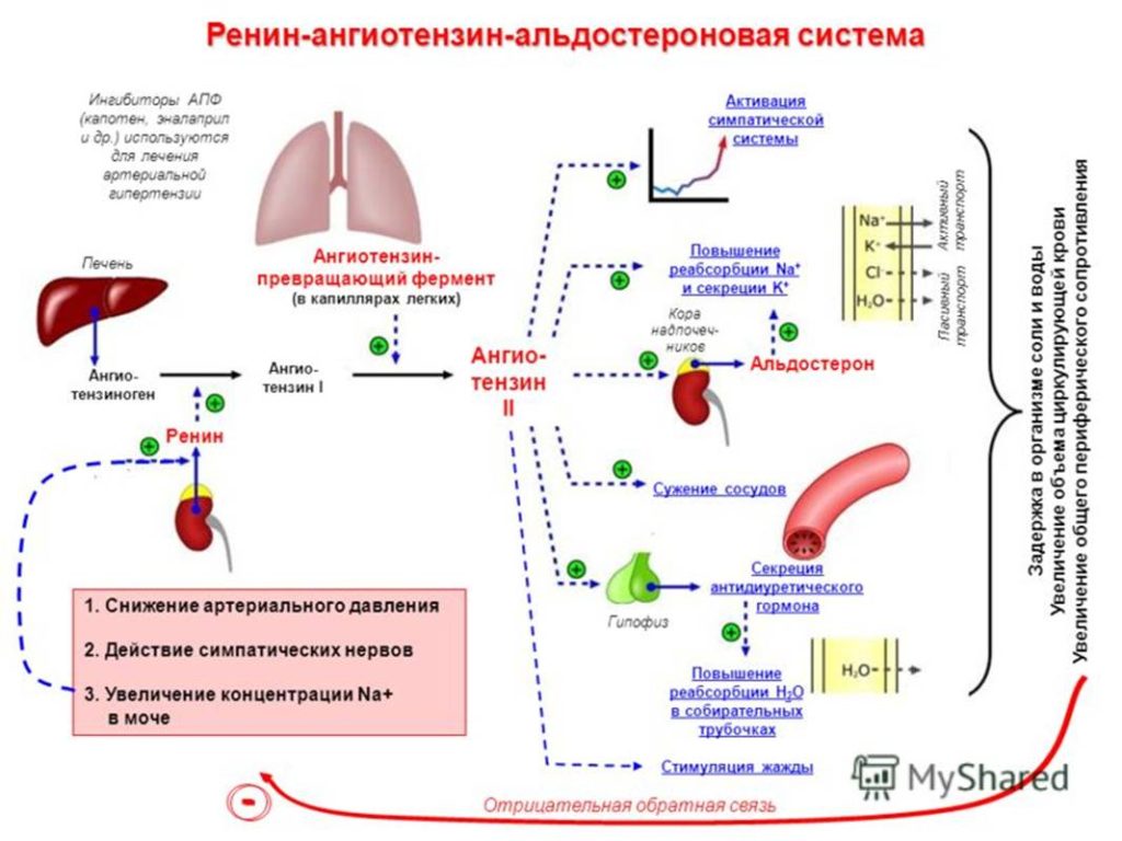 Так, давайте сформулюємо ще раз. У нас у крові постійно присутній цей білок — ангіотензиноген, вірно? Цей білок виробляється печінкою і є одним із білків плазми. Білок плазми ангіотензиноген циркулює в нашій крові постійно. Якщо швидкість клубочкової фільтрації в нирках занадто низька, нирки виділяють ренін, який є ферментом. І звичайно ж, це гормон. Цей гормон активує ангіотензиноген в ангіотензин. Ангіотензин чинить два ефекти.