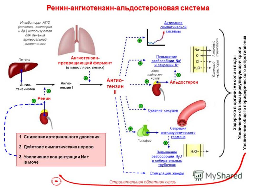 Так, давайте сформулюємо ще раз. У нас у крові постійно присутній цей білок — ангіотензиноген, вірно? Цей білок виробляється печінкою і є одним із білків плазми. Білок плазми ангіотензиноген циркулює в нашій крові постійно. Якщо швидкість клубочкової фільтрації в нирках занадто низька, нирки виділяють ренін, який є ферментом. І звичайно ж, це гормон. Цей гормон активує ангіотензиноген в ангіотензин. Ангіотензин чинить два ефекти.