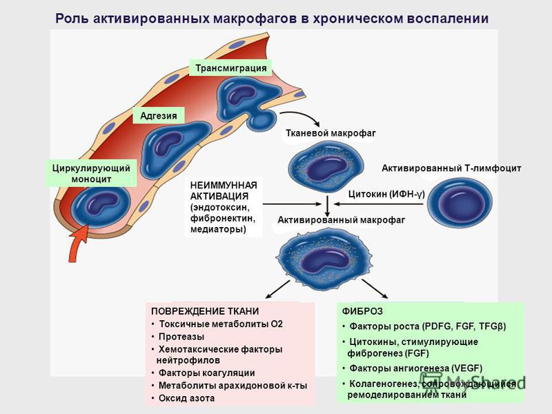 Отак, макрофаги виробляються в кістковому мозку. Вони є одним із видів клітин, із яких складається кістковий мозок. Потім вони випускаються в кровотік, потрапляють у кров у вигляді клітини. Ця клітина називається моноцитом. Так, тобто моноцити — це один із видів білих кров’яних клітин. І по суті, моноцити — це лише циркулюючі в крові макрофаги