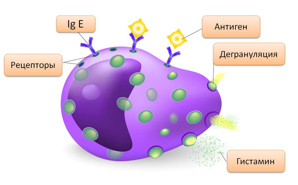 Ну, як, слідкуєте за думкою? Ось ви вдихаєте пилок. Цей пилок взаємодіє з антитілами, які причеплені до мастоцитів, що розташовані прямо під вистилкою вашого носа. Мастоцити починають виділяти гістамін, і у вас виникає запалення тканини, вона червоніє і набрякає, верно? Ваша слизова оболонка набрякає, у результаті ваш ніс забивається, і вам доводиться приймати антигістамін. Ви приймаєте Бенадрил або інший антигістамінний препарат, так. І ви це робите для того, щоб зняти це запалення.