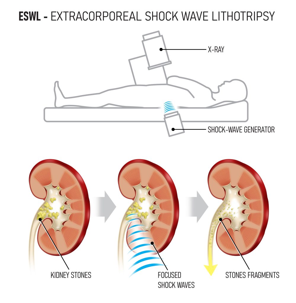 - Механізм: генерація ударної хвилі поза тілом пацієнта, яка фокусується на камені під контролем УЗД або рентгену, руйнуючи його на дрібні фрагменти (пісок), що виходять природним шляхом.